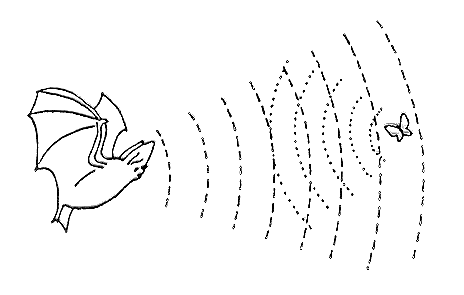 Os morcegos se orientam no escuro por um mecanismo chamado "ecolocalização" ou "sonar dos morcegos". Estes animais emitem gritos, que consistem em ondas.
